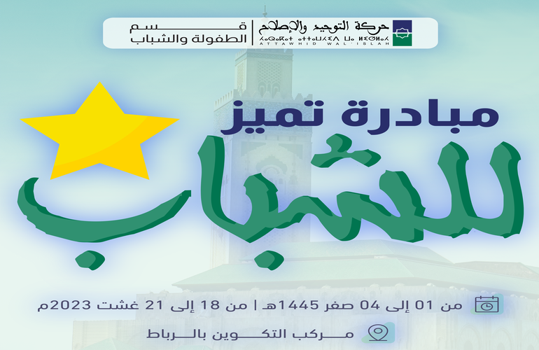 تنطلق اليوم الجمعة 18 غشت 2023، مبادرة تميز للشباب في دورتها الأولى، والتي ينظمها قسم الطفولة والشباب لحركة التوحيد والإصلاح بمشاركة 60 شابا وشابة من التلاميذ والطلبة تم انتقاؤهم من جهات الحركة.