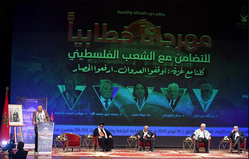 أشاد الأستاذ عبد الإله ابن كيران الأمين العام لحزب العدالة والتنمية في كلمته في المهرجان الخطابي الذي نظمه الحزب أمس الأحد 19 نونبر 2023 بمسرح محمد الخامس بالرباط ببطولات المقاومة في غزة التي أعادت القضية الفلسطينية للواجهة، مشيرا إلى أنه لا يفرق بين الفلسطينيين ويريدهم موحدين في هذه المرحلة الصعبة لمواجهة احتلال غاشم غاصب