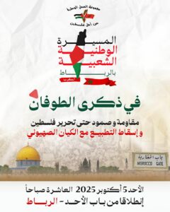 وتأتي هذه المسيرة حسب بلاغ للمجموعة، إحياء للذكرى الثانية لانطلاق معركة طوفان الأقصى المباركة، “التي حققت بها المقاومة الفلسطينية انتصارا تاريخيا كبيرا على قطعان جيش الاحتلال، وهي المعركة التي ما يزال الشعب الفلسطيني يرفع فيها لواء الصمود والشموخ برغم كل مؤامرات التصفية واستمرار حالة الخذلان الخياني المتوازية مع التطبيع الرسمي لعدد من العواصم” .