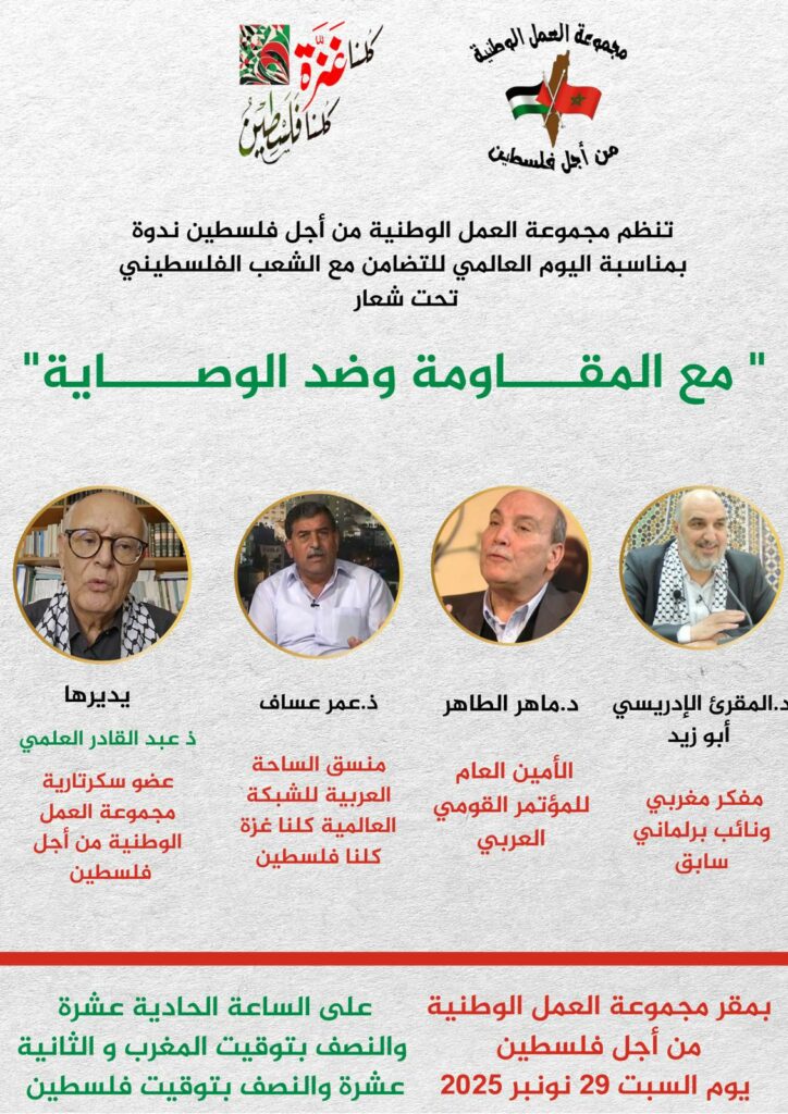 وندوة، تحت شعار :“مع المقاومة وضد الوصاية”، وذلك يوم السبت 29 نونبر 2025 بمقر المجموعة بالرباط، من تأطير كل من: المفكر المقرئ أبو زيد الإدريسي، والدكتور ماهر الطاهر الأمين العام للمؤتمر القومي العربي، والأستاذ عمر عساف منسق الساحة العربية للشبكة العالمية “كلنا غزة كلنا فلسطين”، وسيسيرها الأستاذ عبد القادر العلمي عضو سكرتارية المجموعة.