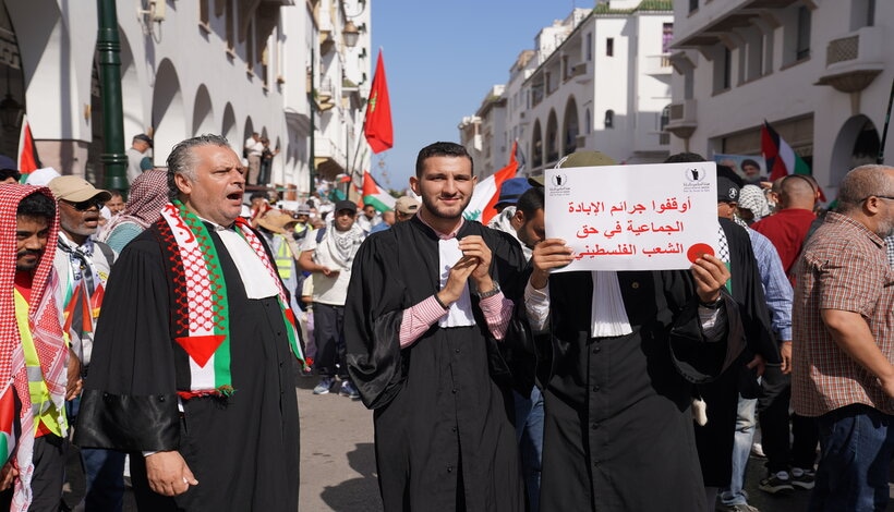 وارتدى المحامون المغاربة الوزرة السوداء، تضامنا مع المحامين ورجال الحقوق والقانون في كل من فلسطين ولبنان، مطالبين بإيقاف المجازر ضد القطاع، ومقاضاة الاحتلال الإسرائيل بسبب ارتكابه لحرب الإبادة الجماعية في القطاع.