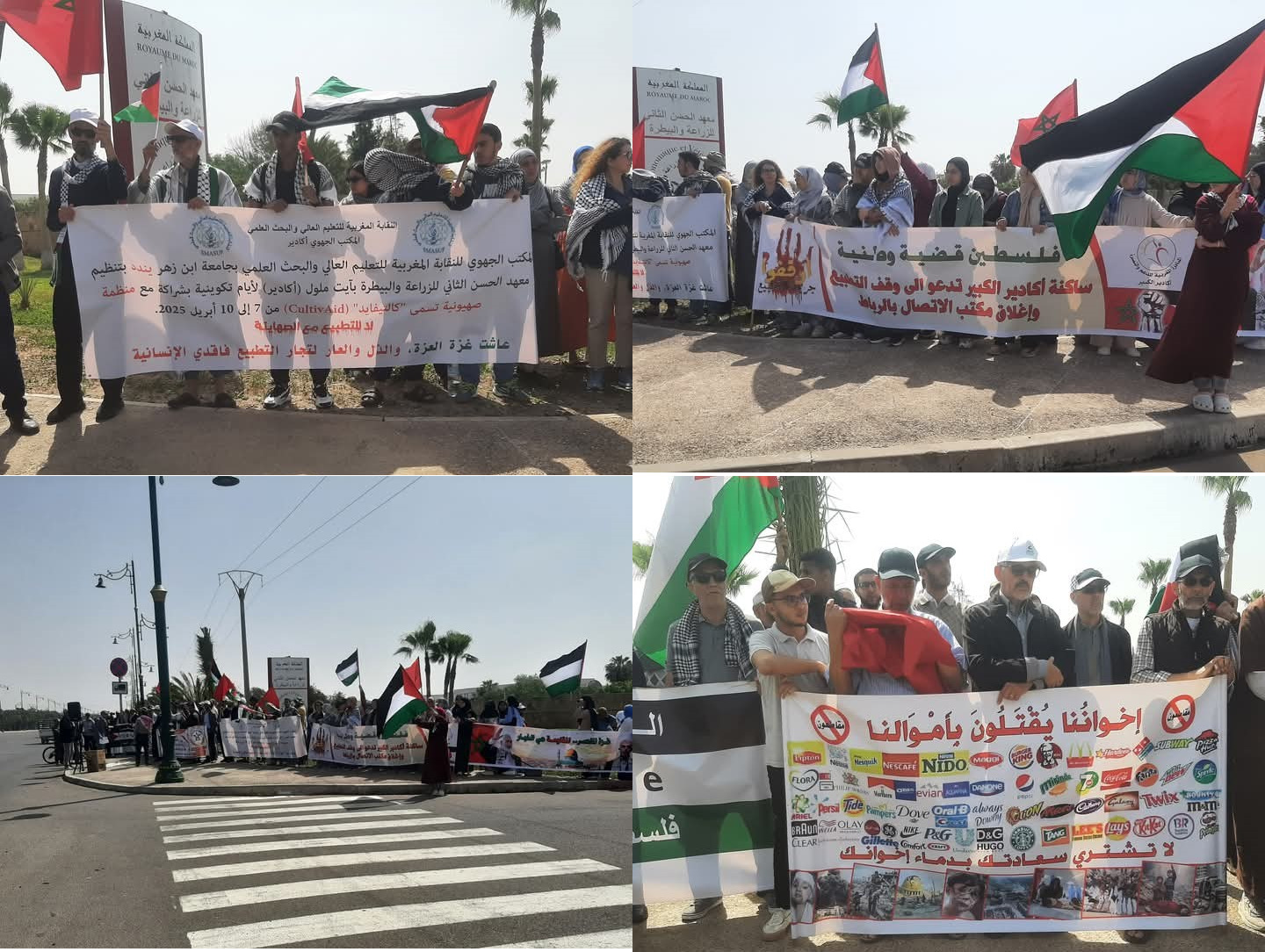 ونظمت اليوم الثلاثاء كل من النقابة المغربية للتعليم العالي والبحث العلمي – المكتب الجهوي بأكادير، والجامعة المغربية للفلاحة بجهة سوس ماسة، والمبادرة المغربية للدعم والنصرة – أكادير الكبير وقفة احتجاجية أمام المعهد بأيت ملول.