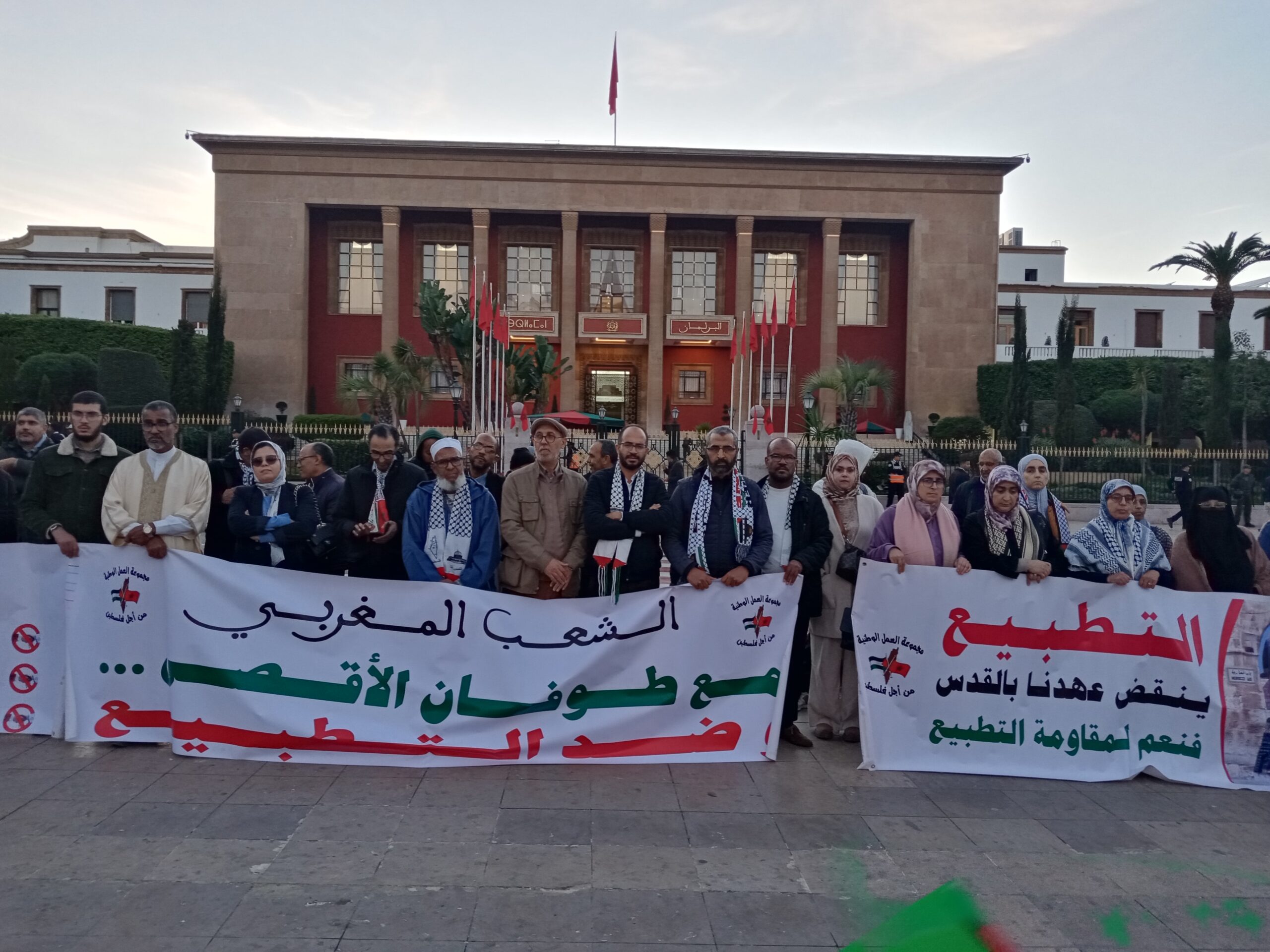 وردد المشاركون شعارات من قبيل “الشعب يديد إسقاط التطبيع”، و”المقاومة أمانة. والتطبيع خيانة”، و”غزة غزة، رمز العزة”، علاوة على “مغاربة مرابطون، للتطبيع رافضون”، و”فلسطين تقاوم، والأنظمة تساوم”.