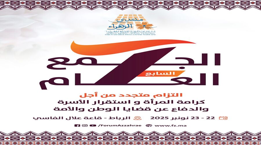 يعقد منتدى الزهراء للمرأة المغربية جمعه العام السابع يومي السبت والأحد 22 و23 نونبر 2025 بالرباط، وذلك تحت شعار: “التزام متجدد من أجل كرامة المرأة واستقرار الأسرة والدفاع عن قضايا الوطن والأمة”.