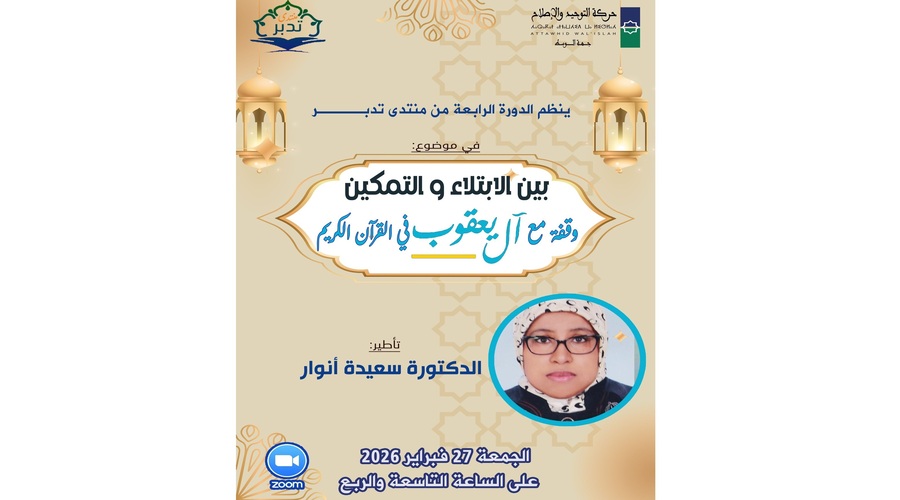 نظم قسم الأسرة لحركة التوحيد والإصلاح بجهة الوسط الأسبوع الماضي، الدورة الرابعة من منتدى تدبر تحت عنوان “بين الابتلاء والتمكين.. وقفة مع آل يعقوب في القرآن الكريم” من تأطير الدكتورة سعيدة أنور.