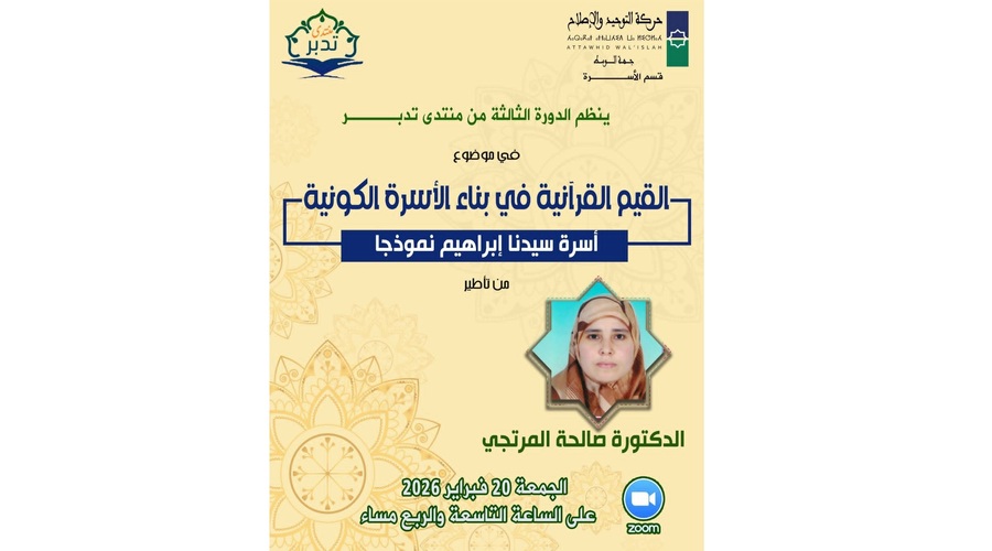 نظّم قسم الأسرة لحركة حركة التوحيد والإصلاح بجهة الوسط مساء يوم الجمعة 20 فبراير 2026 الندوة الثالثة لمنتدى “تماسك” تحت عنوان “القيم القرآنية في بناء الأسرة الكونية: أسرة سيدنا إبراهيم نموذجًا”.