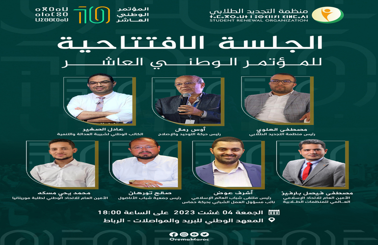 أعلنت منظمة التجديد الطلابي في بلاغ لها توصل موقع الإصلاح بنسخة منه، عن تنظيم الجلسة الافتتاحية لمؤتمرها الوطني العاشر، يوم الجمعة 04 غشت 2023م، ابتداء من الساعة السادسة مساء (18:00)، بالمدرج الرئيسي للمعهد الوطني للبريد والمواصلات.