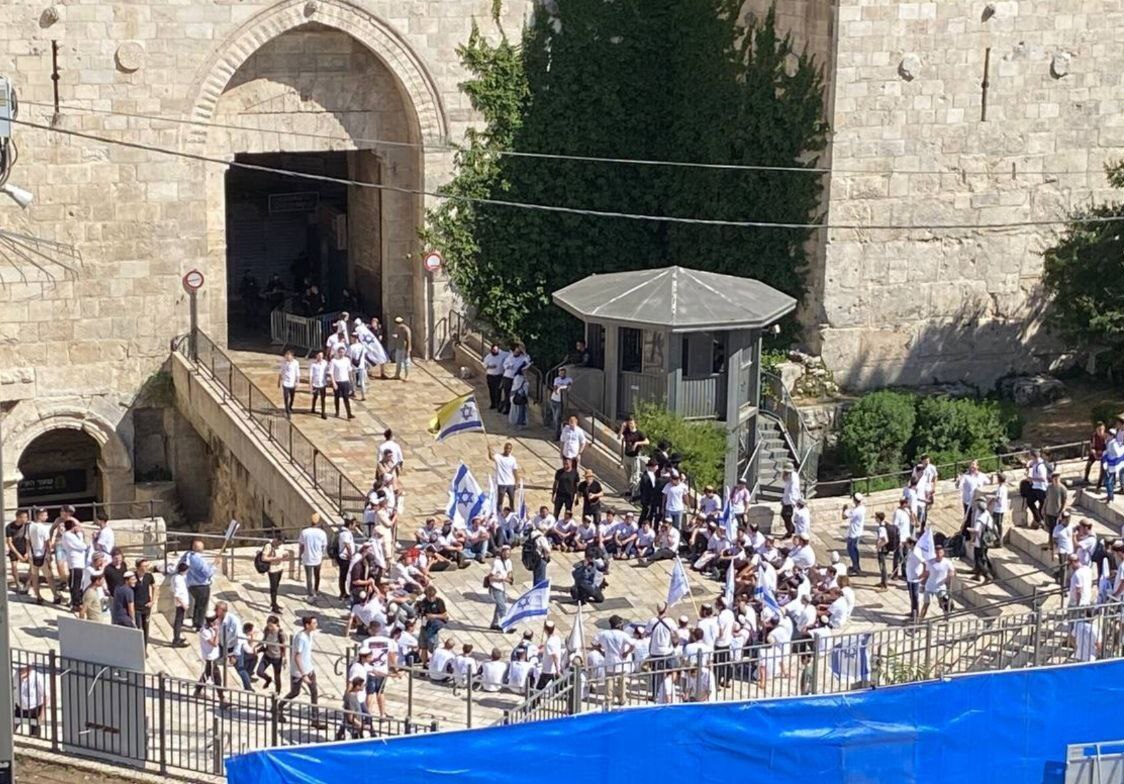 وانتشر المستوطنون، منذ ساعات الصباح في منطقة باب العامود في القدس القديمة، استعدادا لــ”مسيرة الأعلام”، حيث توجهوا إلى البلدة القديمة من “باب الساهرة” رافعين الأعلام “الإسرائيلية”، وبثوا الأغاني الصاخبة مع رقصات استفزازية، وتم توثيق شتم المستوطنين للنبي محمد ﷺ أثناء المسيرة، واعتدوا على الأهالي وعلى الصحفيين وعلى المحلات التجارية، وظهر عدد منهم يحملون السلاح.