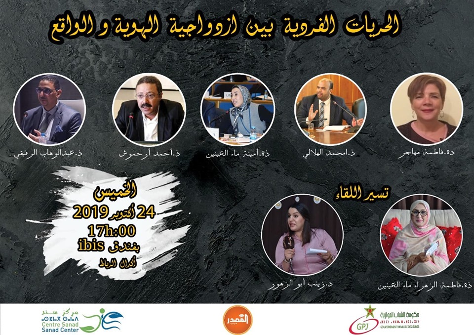 تنظم مؤسسة سند بشراكة مع حكومة الشباب الموازية والمصدر ميديا مساء الخميس 24 أكتور 2019 ندوة بعنوان “الحريات الفردية بين ازدواجية الهوية والواقع” على الساعة 17:00 بفندق “إبيس” – “ibis ” أكدال بالرباط.