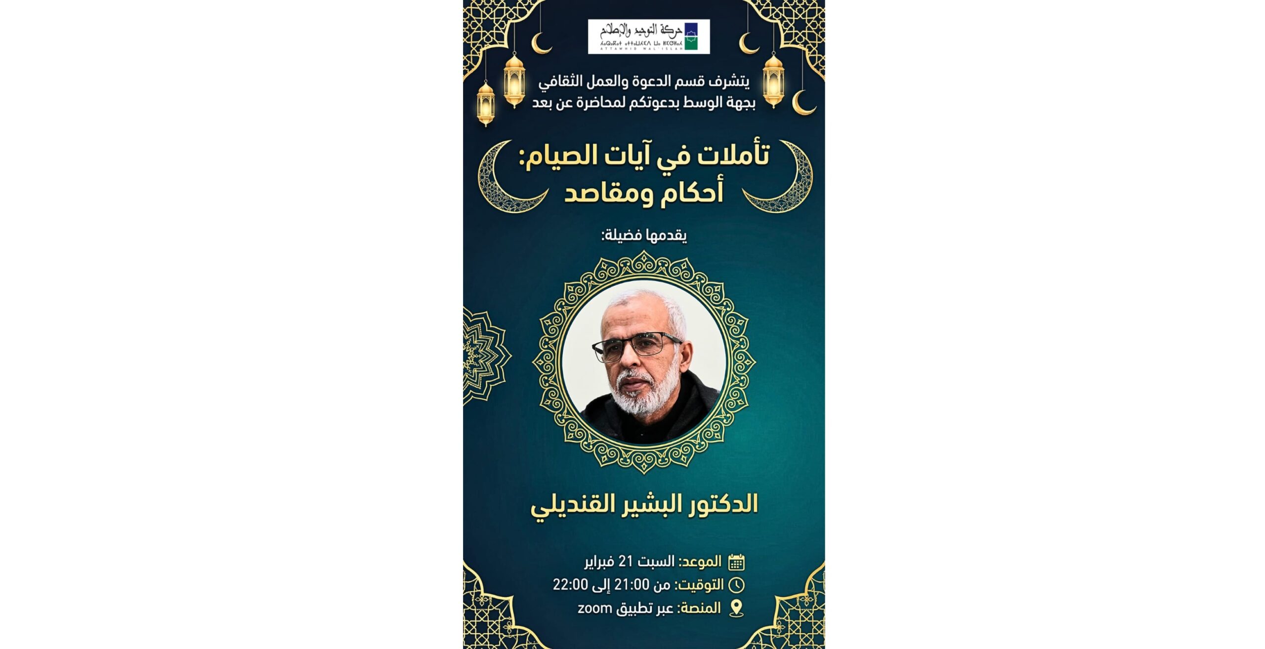 ​نظّم قسم الدعوة والعمل الثقافي بجهة الوسط، مساء الجمعة 21 فبراير 2026، محاضرة علمية عن بُعد تحت عنوان: “تأملات في آيات الصيام: أحكام ومقاصد” أطرها الدكتور البشير القنديلي.