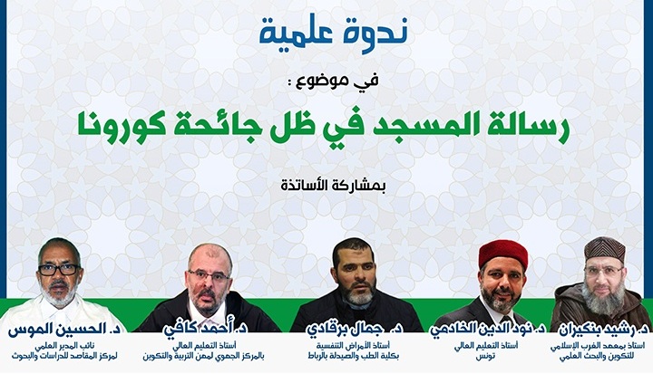 يعقد مركز المقاصد للدراسات والبحوث ندوة علمية في موضوع “رسالة المسجد في ظل جائحة كورونا” يوم الخميس 21 محرم 1442 هـ/ 10 شتنبر 2020 على الساعة السادسة مساء (18:00).