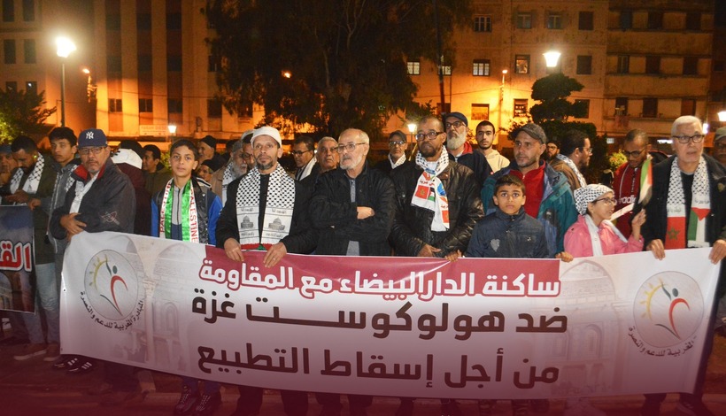 ورفع المشاركون، وهم يزينون أعناقهم بالكوفية الفلسطينية، الرايات المغربية والفلسطينية ولافتات مساندة للقضية الفلسطينية وصور الأطفال الذين استشهدوا في العدوان الإسرائيلي، ورددوا الهتافات المنددة بجرائم الاحتلال بحق سكان وأطفال غزة والضفة الغربية، وطالبوا بإنقاذ حياتهم وحياة عائلاتهم ووقف العدوان الإسرائيلي على غزة.