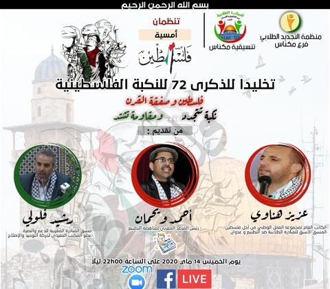 تخلد منظمة التجديد الطلابي فرع مكناس والمبادرة المغربي ضد التطبيع والعدوان الذكرى 72 للنكبة الفلسطينية عبر أمسية فلسطين.