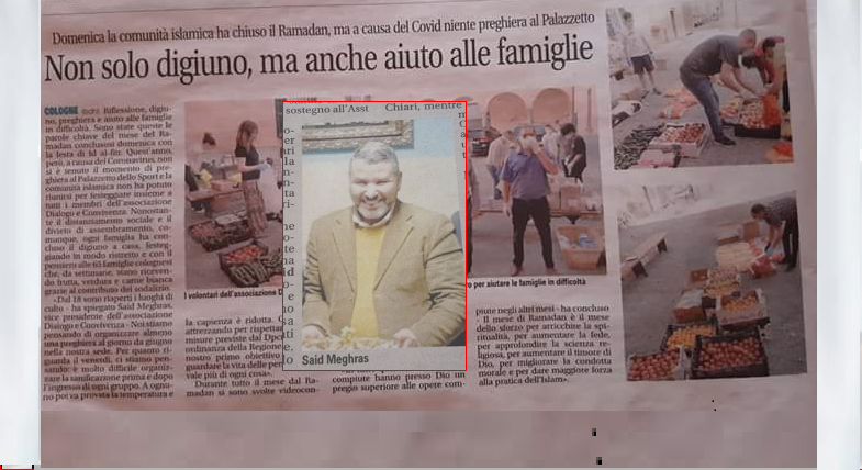 كما شملت هذه المبادرات النوعية تقديم مساعدات للمستشفيات، وللمرضى، وذويهم، وكذا التواصل مع الأطقم الطبية العاملة في هذه المؤسسات الصحية. وأعطى الأستاذ مغراس مثالا من منطقة بريشيا، حيث قدر مجموع التبرعات التي ساهمت بها مساجد بريشيا بحوالي 70 ألف أورو، للتخفيف من الآثار الاجتماعية والاقتصادية لهذه الجائحة. كما قدمت مساعدات للسجناء. فضلا تنظيم اللجنة الاجتماعية التابعة لجمعية حوار وتعايش بالمركز الاسلامي لحملة اجتماعية لمساعدة العائلات المتضررة في أكثر من عشر قرى بنواحي كولوني، وشملت هذه الحملة توزيع القفف تحتوي على مواد غذائية، على عدد كبير من الأسر المحتاجة، وذلك بالتعاون مع المجلس البلدي والكنيسة.
