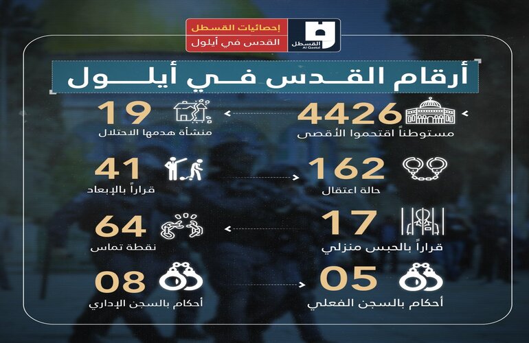 ووثقت شبكة “القسطل” اعتقال قوات الاحتلال 162 مقدسيا خلال شهر شتنبر، وأصدرت 5 أحكام بالسجن الفعلي بحق مقدسيين، و8 أحكام بالسجن الإداري، فيما أصدرت سلطات الاحتلال 17 قرارا بالحبس المنزلي بحق مقدسيين، من ضمنهم الصحفية المقدسية لمى غوشة.