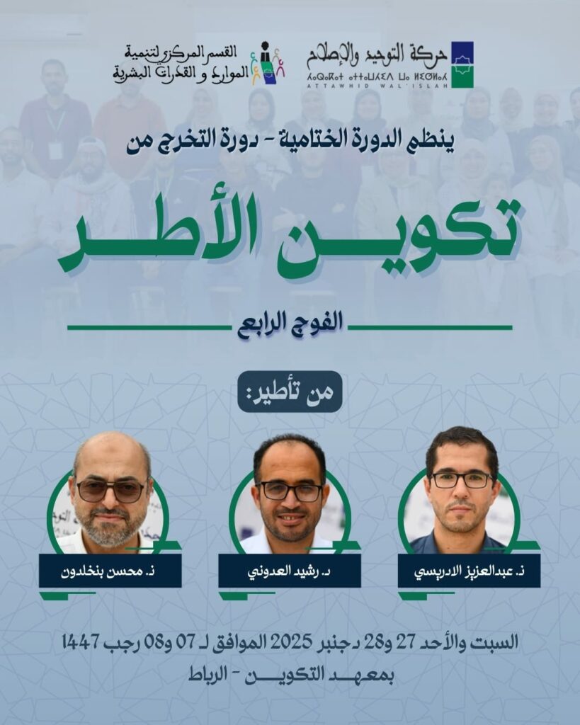 ينظم قسم الموارد والقدرات البشرية لحركة التوحيد والإصلاح دورة تخرج الفوج الرابع لمشروع تكوين الأطر 2023 – 2025 يومي السبت والأحد 27 و 28 دجنبر 2025 بمركز التكوين بالرباط.