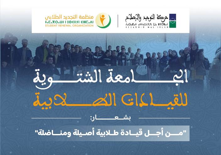 تحت شعار “من أجل قيادة طلابية أصيلة ومناضلة”، تنظم منظمة التجديد الطلابي بشراكة مع حركة التوحيد والإصلاح، الجامعة الشتوية للقيادات الطلابية، وذلك أيام 25-26-27 فبراير 2022 بمدينة فاس.