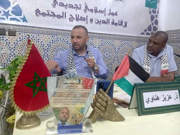 وأطر المحاضرة الأستاذ عزيز هناوي الكاتب العام للمرصد المغربي لمناهضة التطبيع والكاتب العام لمجموعة العمل من أجل فلسطين، وقدم له درع التكريم بعد نهاية المحاضرة، نظير جهوده في خدمة القضيتين الوطنية والفلسطينية.