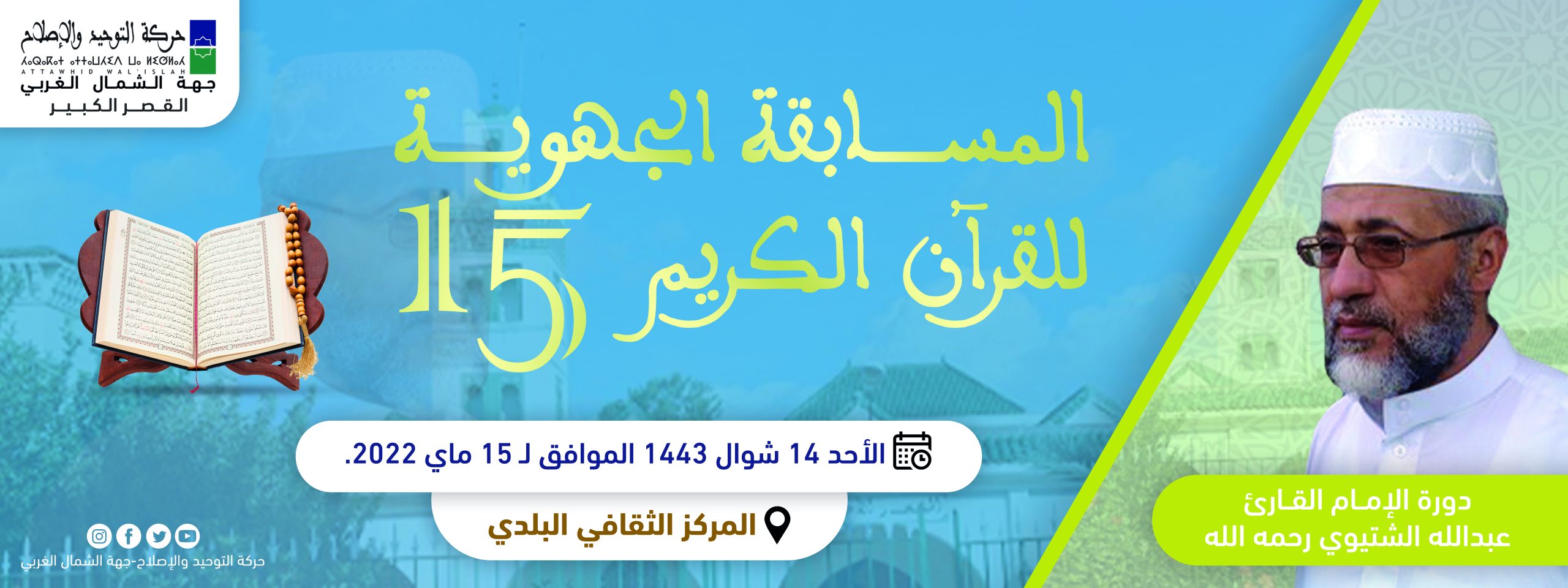 ينظم الفرع الاقليمي للحركة بالقر الكبير الحفل الختنامي للمسابقة الجهوية للقرآن الكريم في دورتها الـ15 – دورة الإمام القارئ عبد الله الشتيوي رحمه الله.