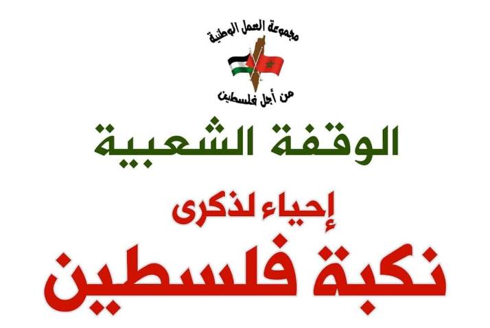 تستعد مجموعة العمل الوطنية من أجل فلسطين تنظيم وقفة شعبية بمناسبة ذكرى نكبة فلسطين، تحت شعار: “لا نكبة مع المقاومة في فلسطين ولا تطبيع مع الصهينة الشاملة للمغرب”، وذلك يوم الأحد 15 ماي 2022 في الساعة السادسة مساء (18.00) أمام البرلمان بالرباط.
