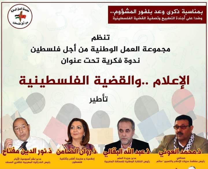 بمناسبة وعد بلفور المشؤوم وضدا على أجندة التطبيع وتصفية القضية الفلسطينية، تعقد مجموعة العمل الوطنية من أجل فلسطين ندوة فكرية تحت عنوان “الإعلام.. والقضية الفلسطينية”.