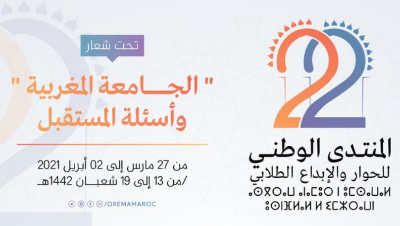 من المنتظر أن تنطلق مساء اليوم السبت 27 مارس 2021 أشغال المنتدى الوطني للإبداع والحوار الطلابي، في دورتها ال22، كمحطة سنوية تنظمها منظمة التجديد الطلابي لطرح قضايا الجامعة والتعليم والعمل الطلابي، حيث تقرر تنظيمها نصف حضوري بسبب الحالة الوبائية التي تعيشها بلادنا.