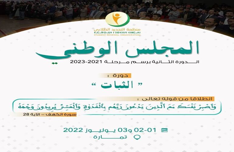 يعقد المجلس الوطني لمنظمة التجديد الطلابي دورته الثانية برسم مرحلة 2021-2023، دورة “الثبات”، انطلاقا من قوله تعالى {وَٱصْبِرْ نَفْسَكَ مَعَ ٱلَّذِينَ يَدْعُونَ رَبَّهُم بِٱلْغَدَوٰةِ وَٱلْعَشِيِّ يُرِيدُونَ وَجْهَهُۥ}، وذلك أيام الجمعة والسبت والأحد 1، 2 و3 يوليوز 2022، بمدينة تمارة.