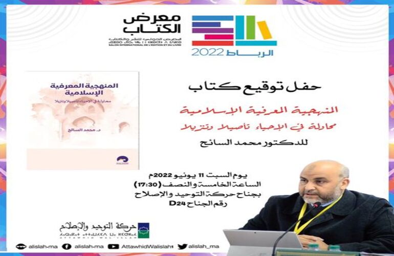 سيعرف رواق حركة التوحيد والإصلاح بالمعرض الدولي للكتاب والنشر غدا السبت 11 يونيو 2022 حفل توقيع كتاب “المنهجية المعرفية الإسلامية محاولة في الإحياء تأصيلا وتنزيلا”، بحضور كاتبه الدكتور محمد السائح.